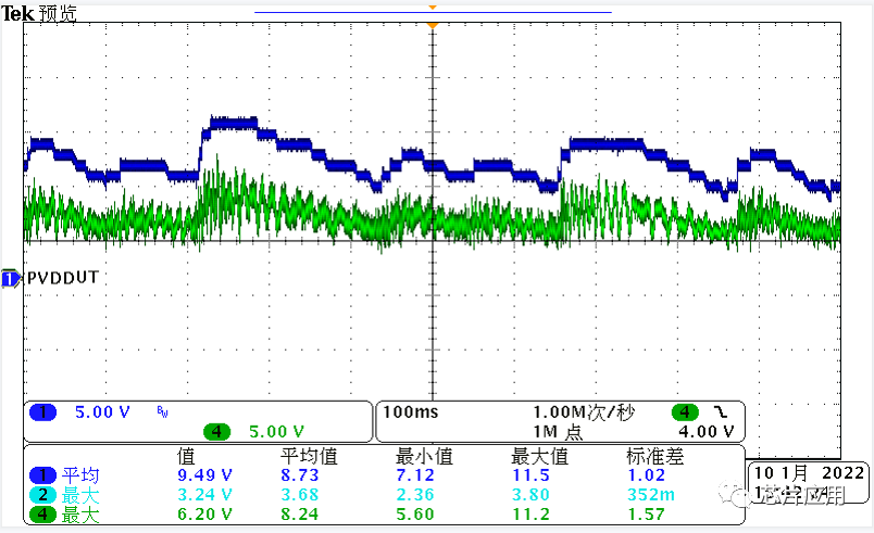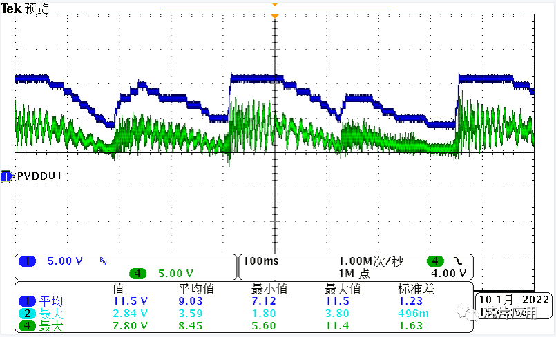 CLASS H功能替代這種固定升壓的方案,必將成為新一代便攜式產(chǎn)品的趨勢。下圖來展示一下ACM3108,在CLASS H功能下,PVDD的變化。下圖藍(lán)色是DCDC的PVDD,綠色是音頻輸出信號。