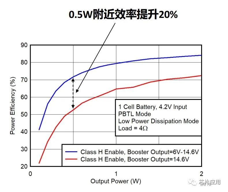 這里重點(diǎn)介紹的就是CLASS H的顯著作用。CLASS H就是根據(jù)音樂信號動態(tài)調(diào)整升壓。傳統(tǒng)的方式是DCDC升壓到一個固定電壓,比如15V,從電池電壓升壓到15V,升壓芯片的壓力會比較大,就像跨臺階一樣,跨的越大壓力越大,效率會大幅降低,從而帶來的發(fā)熱量大幅增加。這種傳統(tǒng)固定升壓的方案,使得這種DCDC壓力得不到釋放,不管音樂信號平均幅度是多小,升壓芯片都要維持低效率狀態(tài),發(fā)熱量也得不到降低。