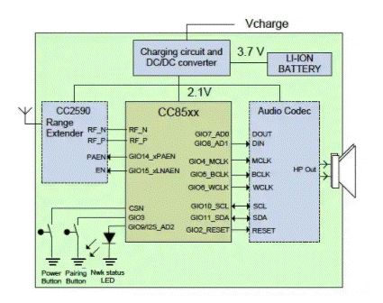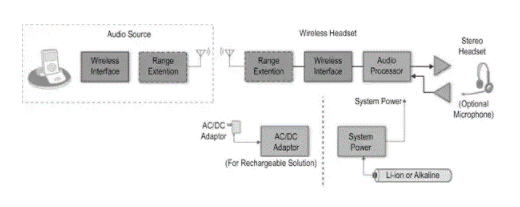 在典型的無線娛樂系統(tǒng)(圖 1)中,源信號(hào)通過帶有可選范圍擴(kuò)展器的無線射頻接口傳輸?shù)讲シ牌飨到y(tǒng),例如立體聲耳機(jī)或揚(yáng)聲器。在播放器內(nèi),相應(yīng)的無線射頻接口接收信號(hào)以供編解碼器、音頻處理器或 DSP 處理,以創(chuàng)建驅(qū)動(dòng)到揚(yáng)聲器的最終模擬信號(hào)。一個(gè)適當(dāng)?shù)碾娫,通常包括一個(gè)電池和充電管理電路,完成了系統(tǒng)。