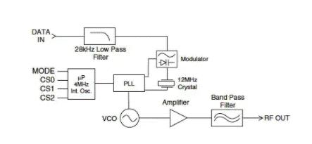 圖 3:TXM-900-HP3 發(fā)射器信號(hào)路徑使用 MCU 控制的 PLL 在 900 MHz 頻帶中提供軟件控制的通道選擇。(由 Linx Technologies 提供。)
