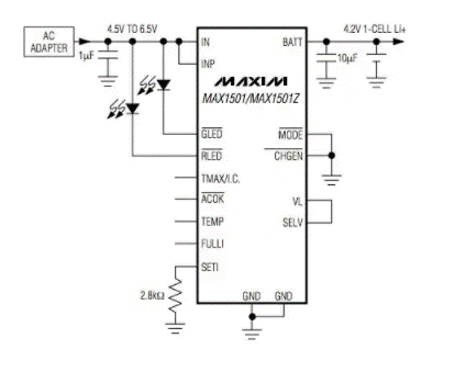 此類設(shè)備可用作恒流/恒壓充電控制器,并提供大量附加功能。Analog Devices ADP2291 支持從深度放電到涓流充電的多步充電模式,具有全方位的保護(hù)功能,包括在檢測(cè)到電池故障時(shí)停止充電模式。凌力爾特 LTC1734 不僅可以直接為鋰離子電池充電,還可以用作為鎳鎘 (NiCd) 和鎳氫 (NiMH) 電池充電的電流源,并且在停機(jī)和睡眠模式下,功耗接近于零。 Maxim MAX1501 集成了典型的電流檢測(cè)電阻、傳輸晶體管和熱調(diào)節(jié)電路,為鋰離子、鎳鎘和鎳氫電池充電提供了一個(gè)非常簡(jiǎn)單的解決方案(圖 8)。