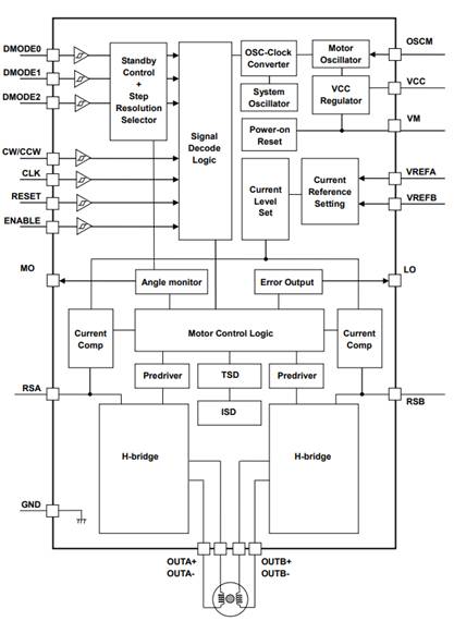 錯誤檢測標(biāo)識輸出功能:TB67S109AFTG具有錯誤檢測功能,當(dāng)驅(qū)動芯片檢測到發(fā)生熱關(guān)斷(TSD)、過流(ISD)時就會觸發(fā)錯誤檢測標(biāo)識輸出功能,從LO引腳將低電平信號輸出到外圍模塊,實現(xiàn)快速處理故障操作。