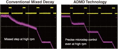 采用高級動態(tài)混合衰減(ADMD)技術(shù),動態(tài)調(diào)整混合衰減比例,優(yōu)化步進(jìn)電機(jī)高速電流驅(qū)動。如下圖所示,在高速電流驅(qū)動狀態(tài)下,傳統(tǒng)的方式可能會發(fā)生失步現(xiàn)象(圖左),而ADMD則可以實現(xiàn)精準(zhǔn)的控制(圖右)。采用ADMD技術(shù)能夠?qū)崿F(xiàn)更緊密的輸入電流跟蹤,從而進(jìn)一步強化了高轉(zhuǎn)速條件下的高效電機(jī)控制。