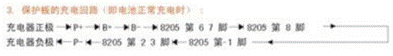 當電池通過充電器正常充電時,隨著充電時間的增加,電芯的電壓將越來越高,當電芯電壓升高到4.4V時,DW01 將認為電芯電壓已處于過充電電壓狀態(tài),便立即斷開第3腳的輸出電壓,使第3腳電壓變?yōu)?V,8205A內(nèi)的開關(guān)管因第4腳無電壓而關(guān)閉。此時電芯的B-與保護板的P-之間處于斷開狀態(tài)。即電芯的充電回路被切斷,電芯將停止充電。保護板處于過充電狀態(tài)并一直保持。等到保護板的P 與P-間接上放電負載后,因此時雖然過充電控制開關(guān)管關(guān)閉,但其內(nèi)部的二極管正方向與放電回路的方向相同,故放電回路可以進行放電,當電芯的電壓被放到低于4.3V時,DW01 停止過充電保護狀態(tài)重新在第3腳輸出高電壓,使8205A內(nèi)的過充電控制管導通,即電芯的B-與保護板P-又重新接上,電芯又能進行正常的充放電。