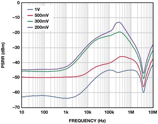 LDO 電源抑制比(PSRR)與裕量電壓相關(guān)——裕量電壓指輸入與輸出電壓之差。對(duì)于固定裕量電壓,PSRR隨著負(fù)載電流的提高而降低,大負(fù)載電流和小裕量電壓條件下尤其如此。圖1所示為ADM7160超低噪聲、2.5V線(xiàn)性調(diào)節(jié)器在200mA 負(fù)載電流和200mV、300mV、500mV 和1V 裕量電壓條件下的PSRR。隨著裕量電壓的減小,PSRR也會(huì)減小,壓差可能變得非常大。例如,在100kHz下,裕量電壓從1V 變?yōu)?00 mV,結(jié)果將使PSRR減少5dB。然而,裕量電壓的較小變化,從500mV 變?yōu)?00mV,結(jié)果會(huì)導(dǎo)致PSRR下降18dB 以上。