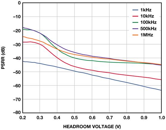 在低裕量工作模式下,需要考慮裕量電壓對(duì)PSRR的影響,否則,會(huì)導(dǎo)致輸出電壓噪聲水平高于預(yù)期。如圖3 所示的PSRR與裕量電壓關(guān)系曲線(xiàn)通?稍跀(shù)據(jù)手冊(cè)中找到,而且可以用來(lái)確定給定條件下可以實(shí)現(xiàn)的噪聲抑制量。