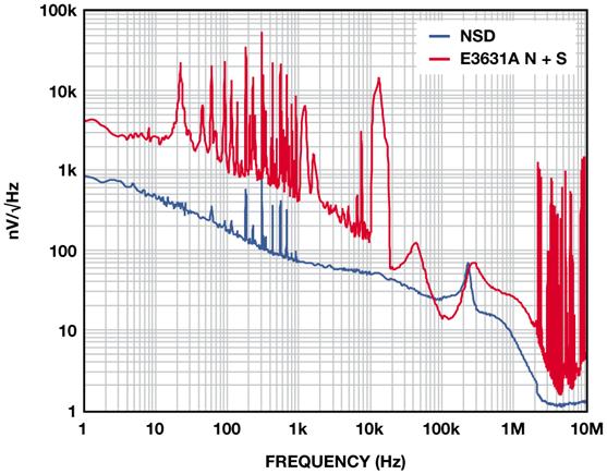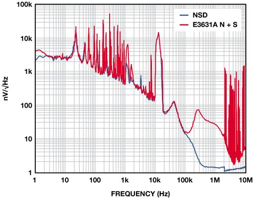 圖4 展示的是2.5 V ADM7160在500 mV裕量和100 mA負(fù)載條件下,相對(duì)于E3631A臺(tái)式電源的輸出噪聲,該臺(tái)式電源在20 Hz至20 MHz范圍內(nèi)的額定噪聲低于350 μV-rms。1 kHz以下的許多雜散為與60 Hz線(xiàn)路頻率整流相關(guān)的諧波。10kHz以上的寬雜散來(lái)自產(chǎn)生最終輸出電壓的DC-DC轉(zhuǎn)換器。1 MHz以上的雜散源于環(huán)境中與電源噪聲不相關(guān)的RF 源。在10Hz至100kHz范圍內(nèi),這些測(cè)試所用電源的實(shí)測(cè)噪聲為56 μVrms,含雜散為104μV。LDO抑制電源上的所有噪聲,輸出噪聲約為9 μV-rms。