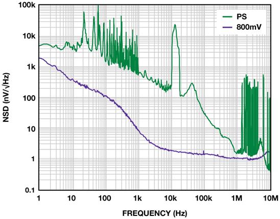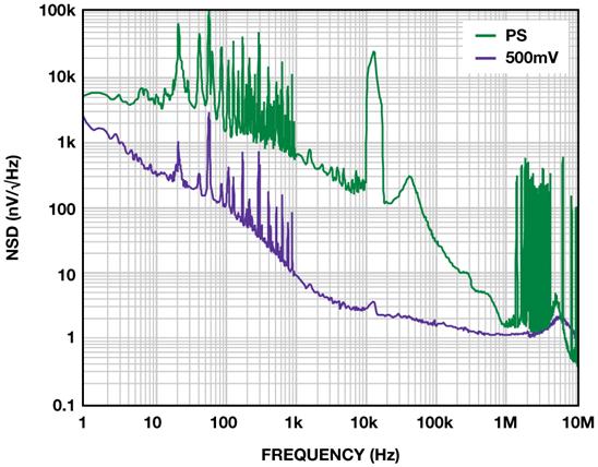 當(dāng)裕量電壓降至200 mV時(shí),隨著高頻PSRR接近0 dB,100 kHz以上的噪聲雜散開(kāi)始穿過(guò)噪底。噪聲略升至10.8 μV rms。隨著裕量降至150 mV,整流諧波開(kāi)始影響輸出噪聲,后者升至12μVrms。在大約250 kHz 處出現(xiàn)幅度適中的峰值,因而盡管總噪聲的增加量并不大,但敏感電路也可能受到不利影響。隨著裕量電壓進(jìn)一步下降,性能受到影響,與整流相關(guān)的雜散開(kāi)始在噪聲頻譜中顯現(xiàn)出來(lái)。圖5所示為100-mV裕量條件下的輸出。噪聲已上升至12.5 μV rms。諧波所含能量極少,因此,雜散噪聲只是略有增加,為12.7 μV rms。