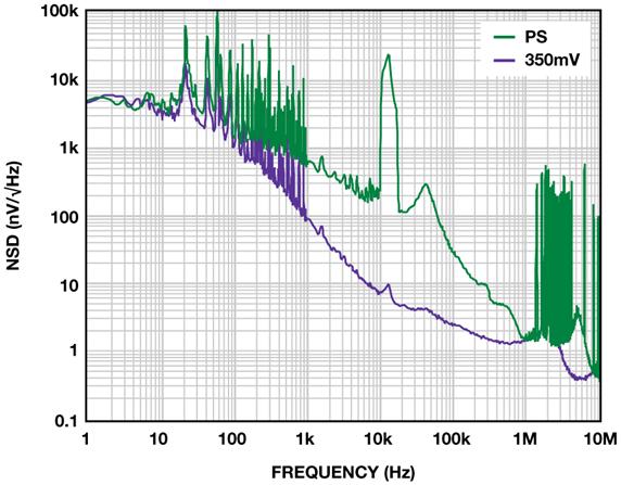 當(dāng)裕量為350 mV時(shí),LDO采用壓差工作模式。此時(shí),LDO再也不能調(diào)節(jié)輸出電壓,充當(dāng)一個(gè)電阻,輸出噪聲升至近76 μV rms,如圖9所示。只有FET的RDSON和輸出端的電容形成的極點(diǎn)衰減輸入噪聲。