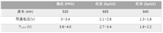 目前,大多數(shù)智能手表及智能手環(huán)都具有生物信息檢測(cè)的功能,該功能通常需要光學(xué)生物傳感模塊(如AFE4410)來(lái)實(shí)現(xiàn),綠光用于心率檢測(cè),紅光或紅外光則用于血氧飽和度檢測(cè),發(fā)出不同顏色光的LED導(dǎo)通電壓也有差異,如下表
