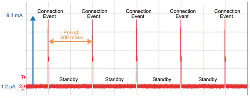 圖 1:對(duì)于許多諸如無(wú)線鎖之類的無(wú)線物聯(lián)網(wǎng)設(shè)備來(lái)說(shuō),其激活和待機(jī)狀態(tài)下的電流消耗存在很大差異。(圖片來(lái)源:Texas Instruments)