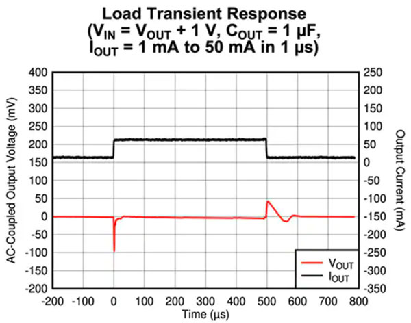 如果快速瞬態(tài)響應(yīng)和低 Iq 對(duì)系統(tǒng)有益,則設(shè)計(jì)者可采用 Texas Instruments 的 TPS7A02。該器件的額定電流為 200 mA,Iq 為 25 nA,Id 為 3 nA。該器件支持 0.8 V 至 5.0 V 輸出電壓,可按 50 mV 步長(zhǎng)進(jìn)行設(shè)定。該 LDO 的典型瞬態(tài)響應(yīng)少于為 10 μs 建立時(shí)間,且對(duì)于從 1 mA 到 50 mA 的階梯式負(fù)載變化,有 100 mV 下沖。如圖 3 所示,其響應(yīng)特性在負(fù)載增加和減少時(shí)不同。TPS7A02 的指定結(jié)溫為 -40°C 至 +125℃。