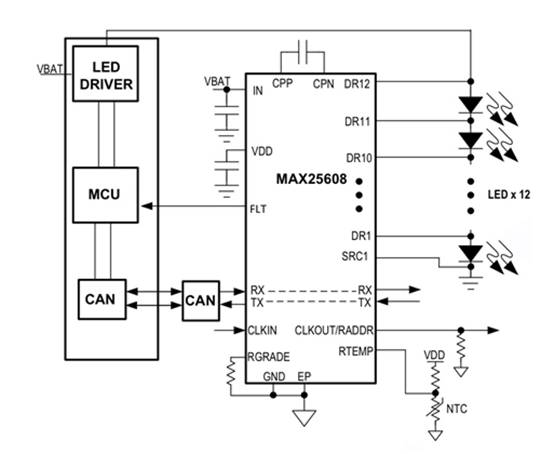 MAX25608可用于矩陣照明、自適應(yīng)駕駛,光束和動畫照明。當(dāng)今越來越多的汽車采用了動畫照明,令新車別具風(fēng)格,彰顯個性特色。動畫照明炫目的光效相當(dāng)復(fù)雜,需要使用更多個LED,且每個LED都需要單獨(dú)控制。MAX25608為汽車LED矩陣動畫照明管理提供了便捷的方案。