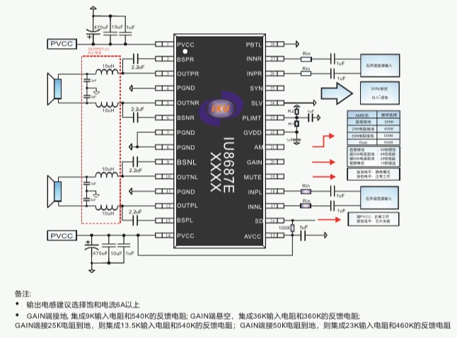 IU8687E是一款2X45W立體聲D類音頻放大器;在供電電壓25V的情況下,負載為8Ω 的情況下最大可以輸出2X45W的連續(xù)功率,在PBTL模式下最大可以輸出88W(負載4Ω )的連續(xù)功率;通過主從模式的設置可以讓IU8687E實現(xiàn)無限級 聯(lián),從而實現(xiàn)系統(tǒng)的多路輸出;IU8687E具備先進的EMI抑制技術(shù),它采用表面貼裝技術(shù),只需少量的外圍器件,便使系統(tǒng)具備高質(zhì)量的音頻輸出功率。IU8687E內(nèi)置了過流保護,短路保護和過熱保護,有效的保護芯片在異常的工作條件下不被損壞。IU8687E最高可達到95%以上的效率, 35V的耐壓設計為芯片提供了超高的可靠性,可以有效的降低生產(chǎn)過程中的不良比例。
