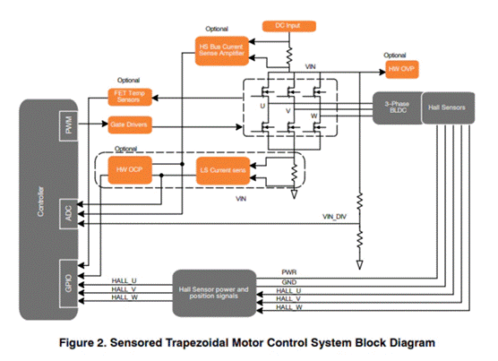 有傳感器式梯形控制不需要任何電壓或電流反饋信號即可運行。它使用來自霍爾傳感器的位置反饋來確定為電機各相位通電的正確順序。安裝在電機上的霍爾傳感器通過轉(zhuǎn)子永磁體旋轉(zhuǎn)磁場產(chǎn)生的霍爾效應(yīng)來感測轉(zhuǎn)子位置。即使在啟動時,也可以進行適當?shù)膿Q向,因為即使在零速下,轉(zhuǎn)子位置信息也存在。