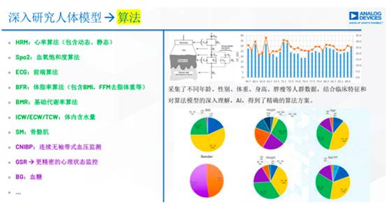 ADI的傳感器分為兩大部分:一是光路部分。通過血管收縮膨脹產(chǎn)生的變化,對反射光采集信息做出判斷,可用于采集心率信息。這個部分極具難度,因為每個人胖瘦不同,手表佩戴的松緊不同,膚色不同,包括體毛、紋身、傷疤等因素都能影響采集精準度。ADI在模擬領域深耕近60年,能提供極高的信噪比,保證信號質量和可測覆蓋度。在不同情況下,比如漏光、環(huán)境光的干擾、動態(tài)光的偽像,ADI也可以提供一整套方案進行動態(tài)干擾抑制,可適配更多的環(huán)境、測試狀態(tài)。此外,ADI還提供穩(wěn)定的算法,自適應的算法,以及應用機器學習的理論。