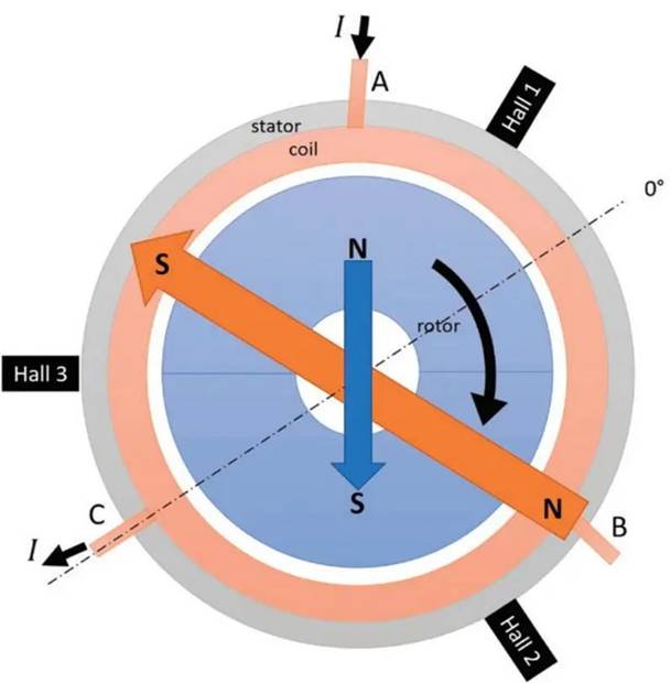圖 2 :無槽無刷直流電機(jī)的橫截面示意圖。藍(lán)色 區(qū)域是帶有兩極永磁體的轉(zhuǎn)子。磁鐵產(chǎn)生的磁場(chǎng) 由藍(lán)色箭頭表示。橙色區(qū)域?yàn)槿嗬@組。當(dāng)電流 從 A 相流向 C 相時(shí)會(huì)產(chǎn)生磁場(chǎng),由橙色箭頭表 示,以便于簡(jiǎn)化。當(dāng)兩個(gè)箭頭對(duì)齊時(shí),轉(zhuǎn)子將旋 轉(zhuǎn)。驅(qū)動(dòng)器變換相位(旋轉(zhuǎn)定子磁場(chǎng),橙色箭頭), 以確保定子和轉(zhuǎn)子磁場(chǎng)之間盡可能保持 90 度(產(chǎn) 生最大扭矩)。