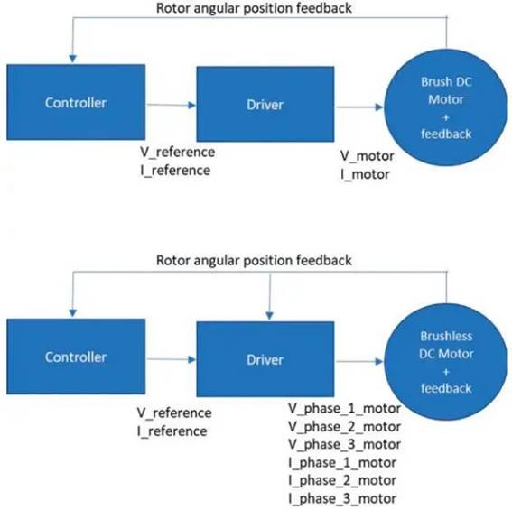 圖 5:有刷直流電機(jī)和無刷直流電機(jī)之間的運(yùn)動(dòng)控制架構(gòu)比較。