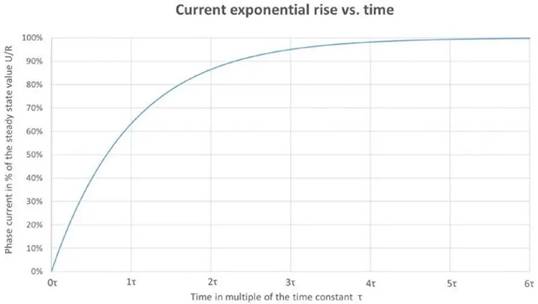 現(xiàn)在,為了簡(jiǎn)單起見,我們不考慮反電動(dòng)勢(shì)。當(dāng)向R L 電路施加電壓或切斷電壓時(shí),電感器將阻止電流的變化。向R L 電路施加電壓U,電流將遵循一階指數(shù)上升,其動(dòng)態(tài)取決于由L / R 比決定的電時(shí)間常數(shù)τ(圖9)。在經(jīng)過5 倍時(shí)間常數(shù)后,它將逐漸達(dá)到穩(wěn)態(tài)值,即99.7%的U/R。