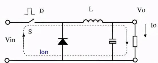 當(dāng)開關(guān)導(dǎo)通時(shí):輸入電壓Vin加到LC濾波器的輸入端,電感上的電流以固定斜率線性上升。如下圖