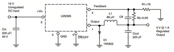 典型的異步降壓轉(zhuǎn)換器應(yīng)用如圖2所示。ON Semiconductor的LM2595是一款單片集成電路,包括主電源開關(guān)和控制電路。該器件采用內(nèi)部補(bǔ)償,最大限度地減少了外部元器件的數(shù)量并簡(jiǎn)化了電源設(shè)計(jì)。其典型轉(zhuǎn)換效率為81%,發(fā)熱損耗為占功率的19%,而同步降壓方案的典型轉(zhuǎn)換效率約90%,發(fā)熱損耗僅占功率的10%。這意味著異步降壓轉(zhuǎn)換器的熱損耗幾乎是同步降壓轉(zhuǎn)換器的兩倍。因此,使用同步降壓轉(zhuǎn)換器可以減少發(fā)熱,從而大大簡(jiǎn)化熱管理難題。