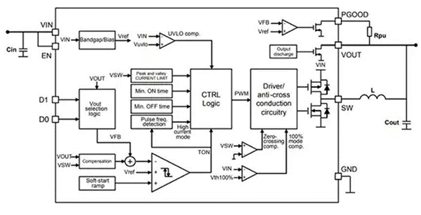 圖4:同步降壓轉(zhuǎn)換器IC框圖顯示了兩個(gè)集成MOSFET(旁邊標(biāo)有“SW”的引腳)和增加的驅(qū)動(dòng)器/防交叉導(dǎo)通電路。(圖片來源:STMicroelectronics)