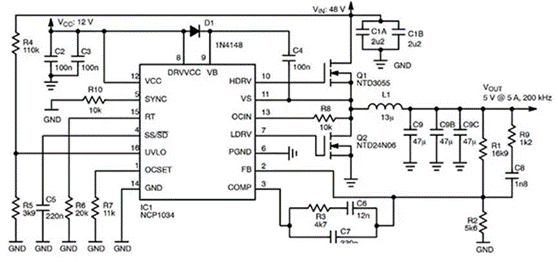 ON Semiconductor的NCP1034DR2G是一款高壓PWM控制器,針對(duì)輸入電壓高達(dá)100伏的高性能同步降壓DC/DC應(yīng)用。該器件設(shè)計(jì)用于嵌入式電信、網(wǎng)絡(luò)和計(jì)算應(yīng)用中的48伏非隔離電源轉(zhuǎn)換。NCP1034驅(qū)動(dòng)一對(duì)外部N溝道MOSFET,如圖7所示。