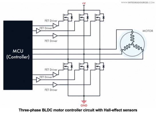 BLDC 電機(jī)控制器使用半 H 橋電路的晶體管切換電流。晶體管的數(shù)量取決于控制器激勵(lì)的相數(shù)或繞組數(shù)。三相無刷直流電機(jī)控制器(最常見的配置之一)需要三個(gè)半H橋,即每相一個(gè)高邊和一個(gè)低邊開關(guān)。