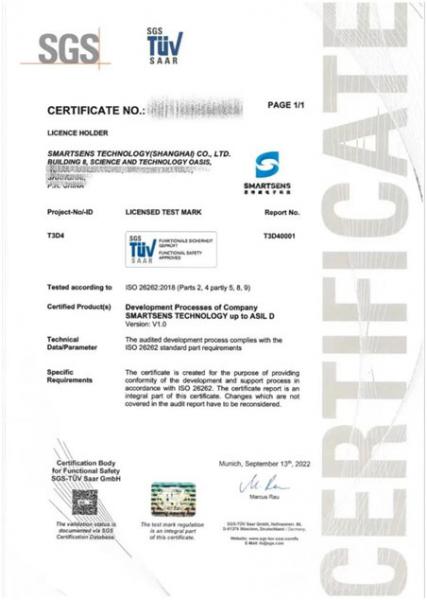 思特威已于本月8日成功獲得ISO 26262:2018汽車功能安全流程ASIL D認(rèn)證證書,這也是思特威在精進(jìn)車規(guī)安全開(kāi)發(fā)體系與流程、打造先進(jìn)車規(guī)級(jí)芯片、推動(dòng)智能汽車行業(yè)高質(zhì)量發(fā)展等方面取得的實(shí)效。