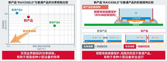 新產(chǎn)品采用融入了ROHM自有IC工藝的晶圓級芯片尺寸封裝*2DSN1006-3(1.0mm×0.6mm),在實現(xiàn)小型化的同時還降低了功耗。與相同封裝的普通產(chǎn)品相比,表示導(dǎo)通損耗和開關(guān)損耗之間關(guān)系的指標(biāo)(導(dǎo)通電阻*3×Qgd*4)改善了20%左右,達(dá)到業(yè)內(nèi)先進(jìn)水平(1.0mm×0.6mm以下封裝產(chǎn)品比較),非常有助于縮減各種小型設(shè)備電路板上的元器件所占面積并進(jìn)一步提高效率。另外,還采用ROHM自有的封裝結(jié)構(gòu),使側(cè)壁有絕緣保護(hù)(相同封裝的普通產(chǎn)品沒有絕緣保護(hù))。在受空間限制而不得不高密度安裝元器件的小型設(shè)備中,使用這款新產(chǎn)品可降低因元器件之間的接觸而導(dǎo)致短路的風(fēng)險,從而有助于設(shè)備的安全運(yùn)行。