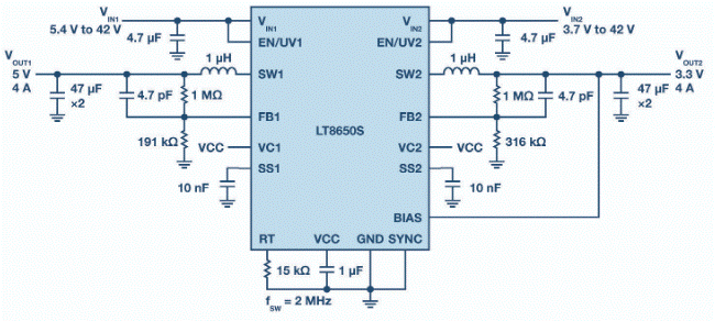圖1.簡化的LT8650S原理圖在2 MHz時(shí)提供5 V/4 A輸出和3.3 V/4 A輸出。