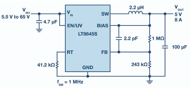圖3.簡化的LT8645S原理圖,在2 MHz時(shí)提供5 V/8 A輸出。