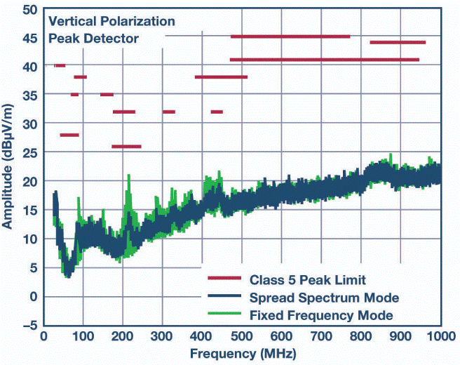 有關(guān)排放輸出特性,請參見圖4。這種改進(jìn)的EMI/EMC性能對電路板布局不敏感,即使在使用2層PC板時(shí)也能簡化設(shè)計(jì)并降低風(fēng)險(xiǎn)。LT8645S可在整個(gè)負(fù)載范圍內(nèi)輕松通過汽車CISPR 25,5類峰值EMI限制。擴(kuò)頻頻率調(diào)制也可用于進(jìn)一步降低EMI水平。