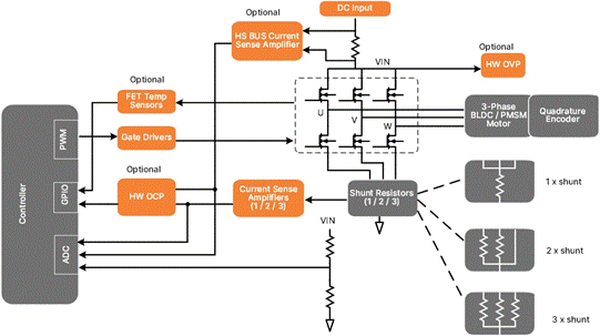 圖3顯示了實(shí)施無傳感器FOC所需的信號(hào)。根據(jù)分流架構(gòu),ADC至少需要一到三個(gè)電流檢測輸入來提供反饋。