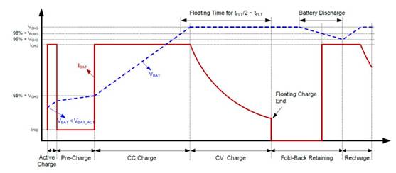 除常規(guī)的預(yù)充電、恒流充電、恒壓充電階段外,SGM41566 還具有特殊設(shè)計的深度放電電池激活充電功能 (Active Charge) 和在電池充滿后的安全電壓回退功能 (Fold-Back Retaining)。當(dāng)電池電壓低于深度放電激活檢測門限時,SGM41566 會以恒流充電電流 ICHG 給電池充電 12.5ms,以快速激活電池,此后會自動進入預(yù)充電階段。滿電安全電壓回退功能則對延長長期掛載設(shè)備的電池壽命有極大的幫助。