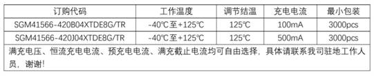 SGM41566 具有完整的預(yù)充電、恒流充電、恒壓充電流程,各階段充電電流均可方便選擇。恒流充電電流 ICHG 在 50mA 至 750mA 范圍內(nèi) 50mA 步進可選;預(yù)充電電流和滿充截止電流在 5%ICHG 至 25%ICHG 范圍內(nèi) 5%ICHG 步進可選,且具有無預(yù)充功能 (No Pre-Charge) 選項來滿足部分電池低壓階段的大電流充電需求。滿充電壓在 3.5V 至 4.8V 范圍內(nèi) 25mV 步進可選,可方便的適用于磷酸鐵鋰電池、錳鋅電池、鋰離子電池、3 節(jié)/4 節(jié)鎳氫電池的電子設(shè)備。