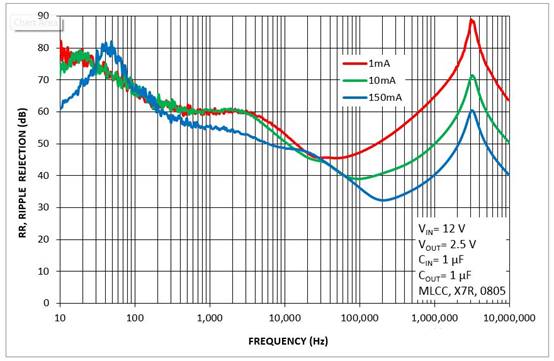 02輸入電壓的快速變化,通常是由DC-DC轉(zhuǎn)換器的輸出電壓紋波引起的,無法通過控制回路完全過濾,于是輸入電壓的變化會一定程度地反映在輸出電壓中,該參數(shù)稱為電源抑制比(PSRR),且通常是頻變參數(shù)。一些制造商標(biāo)示的PSRR為負(fù)數(shù),有些則為正數(shù)。