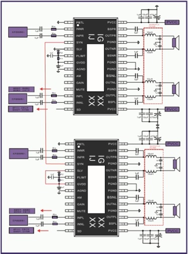 3、IU5706支持12V升壓至24V,給兩顆IU8689供電,輸出4x65W/4歐 ( THD+N=1%);IU8689主從模式可實(shí)現(xiàn)多顆芯片無(wú)限級(jí)聯(lián)功率輸出,此應(yīng)用非常適合車(chē)載音頻后裝市場(chǎng)。