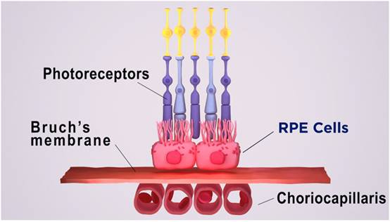 外層血—視網(wǎng)膜外屏障由視網(wǎng)膜色素上皮(RPE)組成,視網(wǎng)膜色素上皮被布魯赫膜與富含血管的脈絡(luò)膜毛細(xì)血管隔開。布魯赫膜調(diào)節(jié)絨毛毛細(xì)血管和RPE之間的營(yíng)養(yǎng)物質(zhì)和廢物的交換。在AMD中,稱為脈絡(luò)膜小疣的脂蛋白沉積物在布魯赫膜外形成,阻礙其功能。隨著時(shí)間的推移,RPE分解,導(dǎo)致光感受器退化和視力喪失。