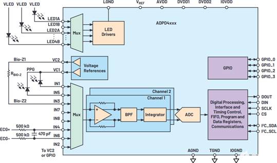 由于ADPD4xxx具有8通道多路復(fù)用器,因此還可以支持輔助輸入來(lái)測(cè)量系統(tǒng)中的電壓、電容、溫度或運(yùn)動(dòng)。