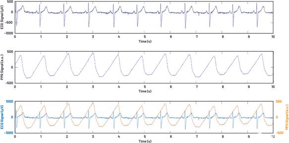 圖2.同時(shí)測(cè)量心電圖和PPG以估計(jì)血壓。
