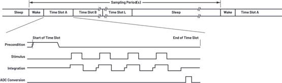 圖 3a 顯示了如何支持時(shí)隙操作。每個(gè)時(shí)隙從前置條件脈沖開(kāi)始,然后是刺激脈沖,最后是光電二極管電流或來(lái)自ADC采樣的另一個(gè)傳感器信號(hào)的信號(hào)。