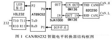 CAN/RS232智能電平轉(zhuǎn)換器硬件電路主要由微處理器AT89C52、獨(dú)立CAN通訊控制器SJAl000、CAN總線驅(qū)動(dòng)器82C250、高速光電耦合器6N136、TTL電平與RS232電平轉(zhuǎn)換器ICL232、LED數(shù)碼管顯示電路以及為SJAl000提供初始地址的撥碼電路組成,其結(jié)構(gòu)框圖如圖1所示。