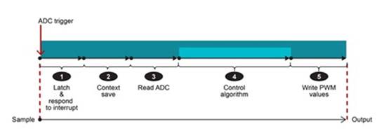 為獲得出色的實(shí)時(shí)控制性能,您必須優(yōu)化整個(gè)信號(hào)鏈,包括硬件和軟件。從 ADC 采樣(來自電機(jī)的輸入)到寫入 PWM(輸出以控制電機(jī))所花費(fèi)的時(shí)間是實(shí)時(shí)控制性能的基本衡量標(biāo)準(zhǔn)。從 ADC 采樣開始,逆變器系統(tǒng)需要準(zhǔn)確快速的采樣,即實(shí)現(xiàn)高采樣率、至少 12 位分辨率和低轉(zhuǎn)換時(shí)間。一旦可進(jìn)行采樣,它需要通過互連傳輸?shù)教幚砥鞑⒂商幚砥髯x取,并優(yōu)化的總線和內(nèi)存訪問架構(gòu)縮短延遲。在處理器中,內(nèi)核需要使用 FOC 算法根據(jù)電機(jī)的相電流、速度和位置計(jì)算下一個(gè) PWM 步驟。