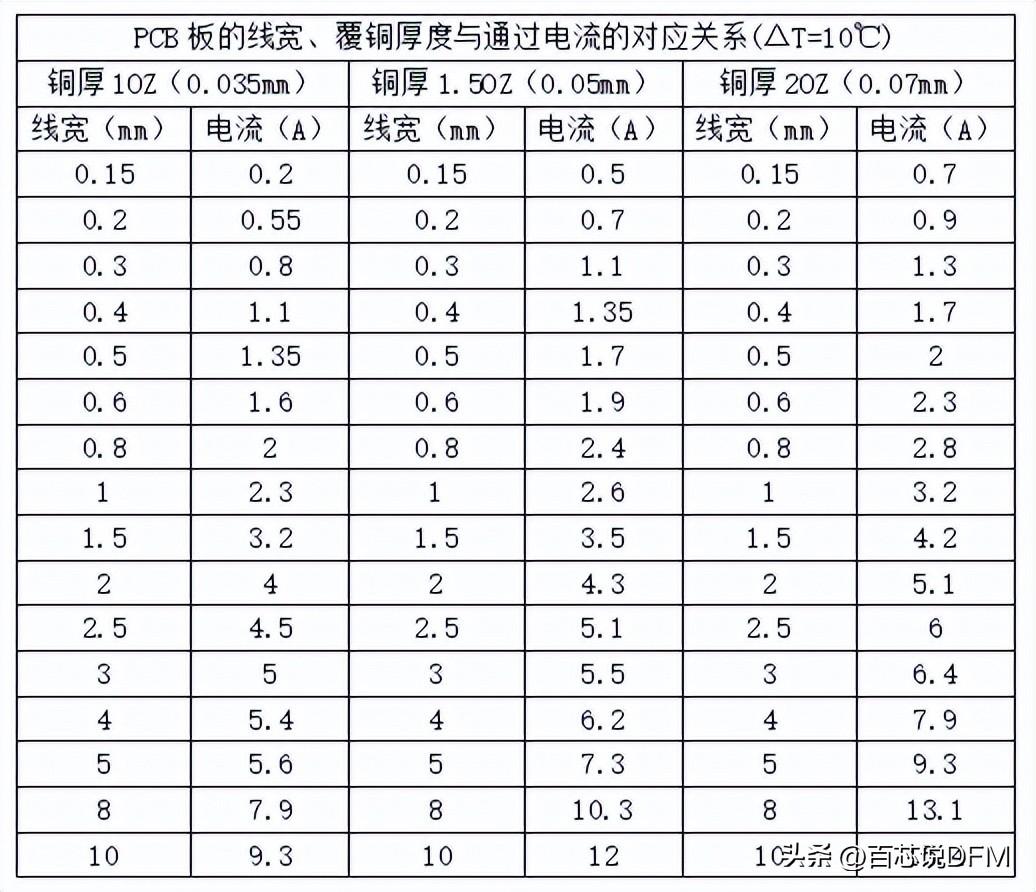 附上溫升10℃時(shí),PCB板的線寬、覆銅厚度與通過(guò)電流的對(duì)應(yīng)關(guān)系供參考。