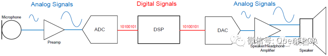 數(shù)字音頻接口DAI,即Digital Audio Interfaces,顧名思義,DAI表示在板級(jí)或板間傳輸數(shù)字音頻信號(hào)的方式。相比于模擬接口,數(shù)字音頻接口抗干擾能力更強(qiáng),硬件設(shè)計(jì)簡(jiǎn)單,DAI在音頻電路設(shè)計(jì)中得到越來越廣泛的應(yīng)用。圖1和圖2對(duì)比傳統(tǒng)的音頻信號(hào)和數(shù)字音頻信號(hào)鏈的區(qū)別。