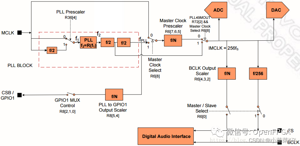 在I2S/PCM接口的ADC/DAC系統(tǒng)中,除了BCLK和FS(LRCLK)外,CODEC經(jīng)常還需要控制器提供MCLK (Master Clock),這是由CODEC內(nèi)部基于Delta-Sigma (ΔΣ)的架構(gòu)設(shè)計(jì)要求使然。MCLK時(shí)鐘頻率一般為256*FS,具體參考特定器件手冊(cè)。
