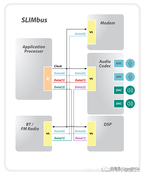 SLIMBUS,全稱 Serial Low-power Inter-chip Media Bus,是MIPI聯(lián)盟指定的一種音頻接口,用于連接基帶/應(yīng)用處理器和音頻芯片,總線協(xié)議保證既能發(fā)控制信息,又能發(fā)數(shù)據(jù)信息,這樣就可以替換傳統(tǒng)的數(shù)據(jù)和控制兩種接口如I2S和I2C。SLIMbus v2.0是兩線制,多分支TDM接口,支持多主機(jī)和多個(gè)設(shè)備。它采用以高達(dá)28MHz的單數(shù)據(jù)速率(SDR)運(yùn)行的CMOS I / O,具有固定的幀大小,支持主控和時(shí)鐘切換功能,以實(shí)現(xiàn)低功耗操作。SLIMbus v2.0還支持多個(gè)多通道,高質(zhì)量音頻流,相位相干性,以實(shí)現(xiàn)立體聲,麥克風(fēng)陣列和其他引人注目的功能。它還支持每臺(tái)設(shè)備最多八個(gè)通道的可擴(kuò)展帶寬,以使峰值聚合帶寬最高達(dá)到224Mbps。