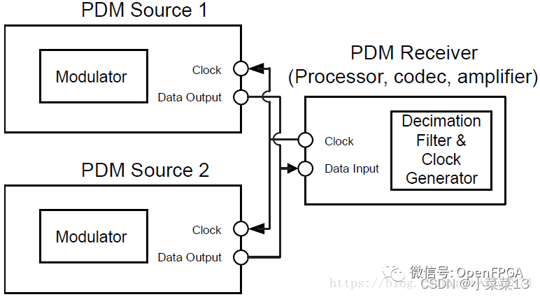 在以PDM方式作為模數(shù)轉(zhuǎn)換方法的應(yīng)用接收端,需要用到抽取濾波器(Decimation Filter)將密密麻麻的0和1代表的密度分量轉(zhuǎn)換為幅值分量。PDM方式的邏輯相對(duì)復(fù)雜,但它只需要兩根信號(hào)線,即時(shí)鐘和數(shù)據(jù)。