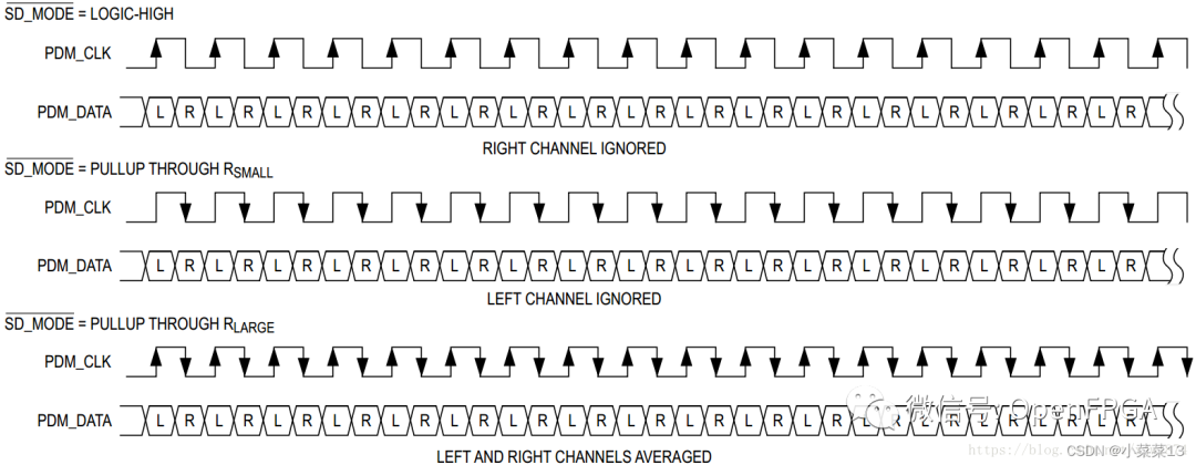下圖為Maxim的Class-D類型功放MAX98358對(duì)PDM接口時(shí)序的要求,可以看到它在PDM_CLK的上升沿采樣左聲道數(shù)據(jù),在PDM_CLK下降沿采樣右聲道數(shù)據(jù)。、